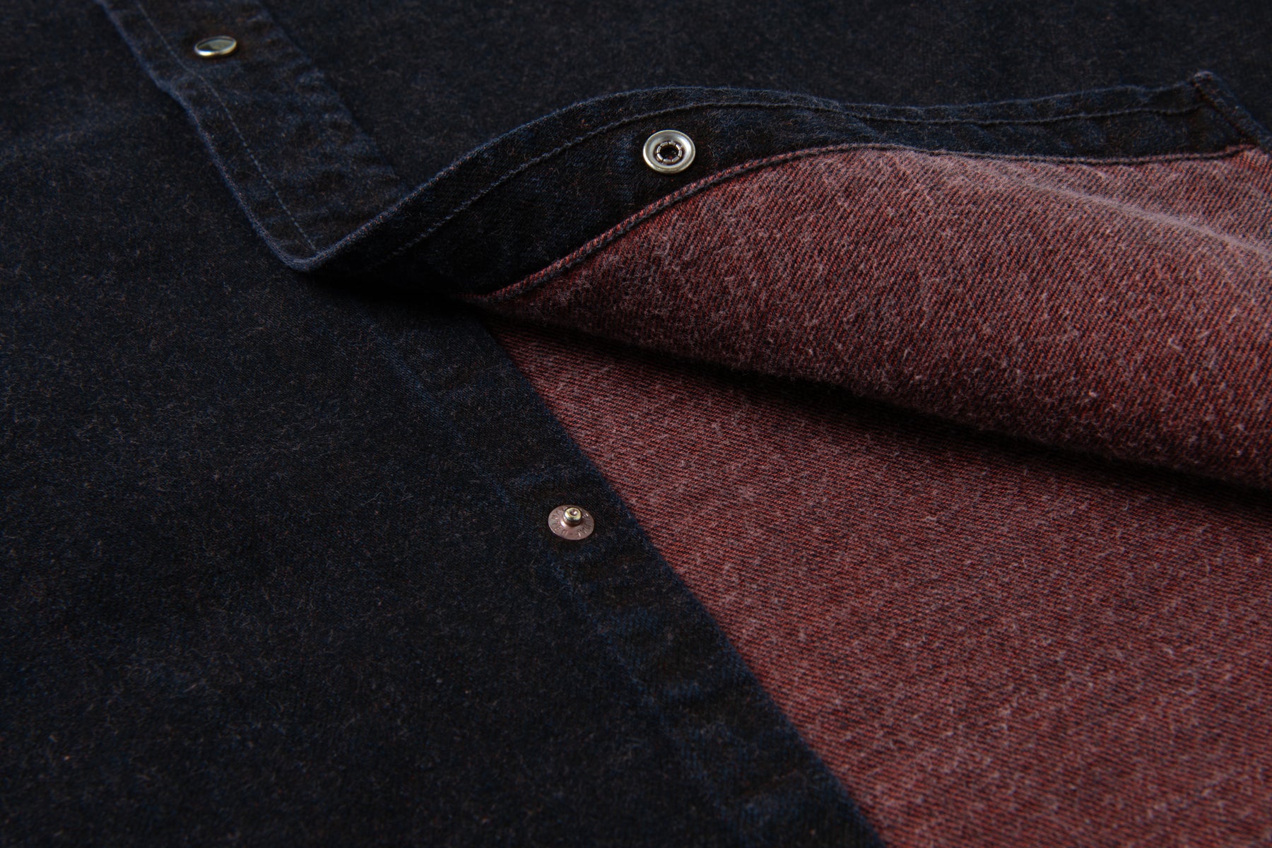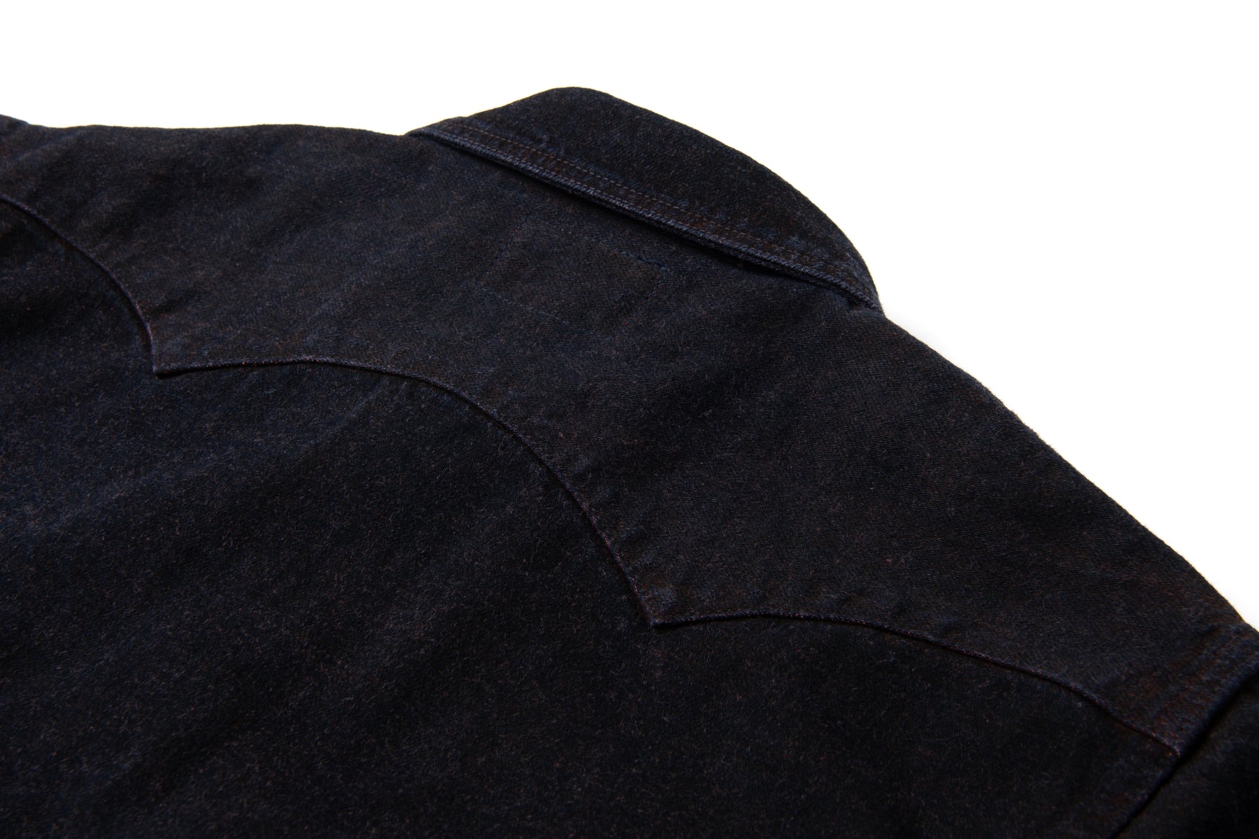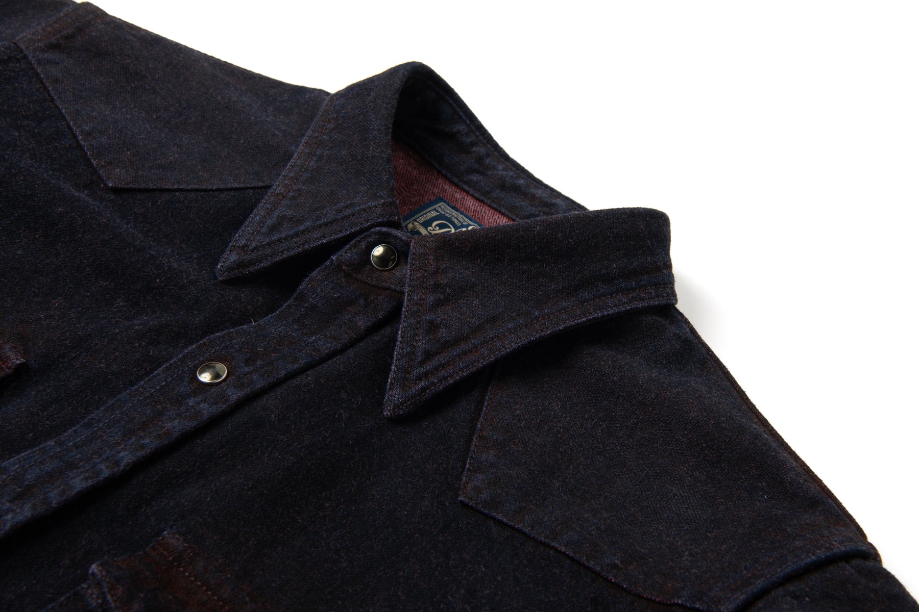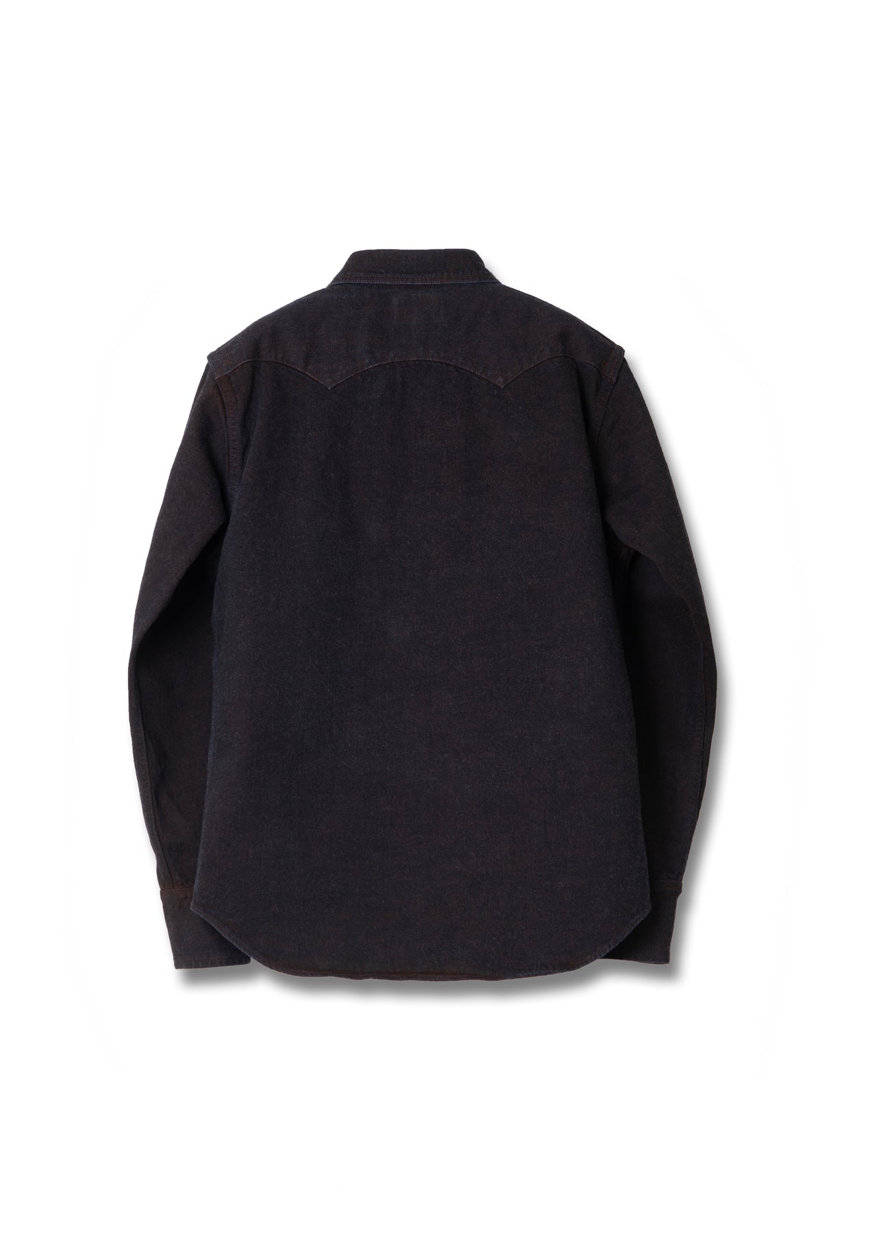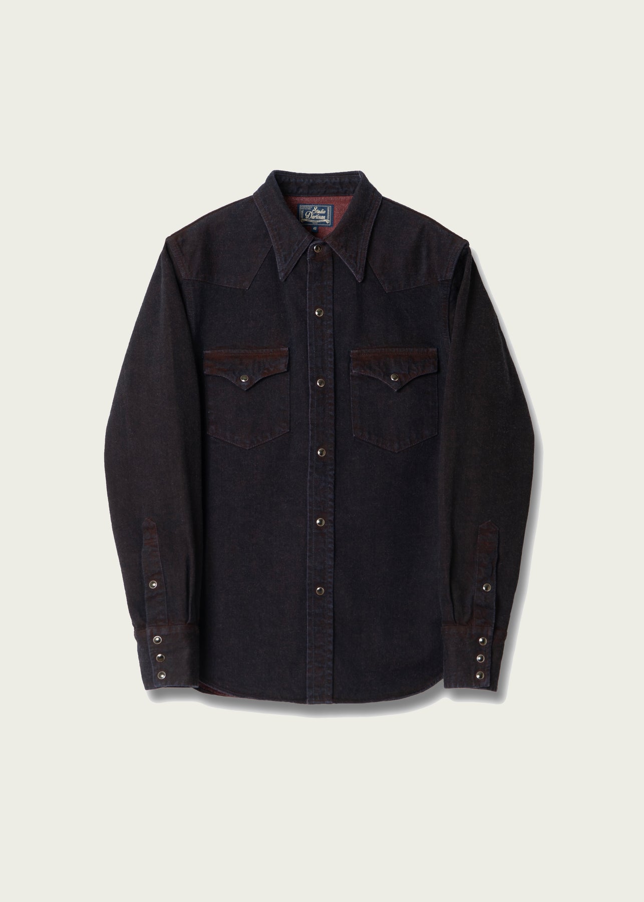 For the D5727, Studio D’Artisan applies this technique to a proprietary 12oz denim, creating a shirt that feels sturdy yet wearable, with an unmistakable earthy presence. The design is rooted in classic Western styling, featuring snap-button closures, a shaped back yoke, and reinforced seams finished with chain stitching for long-term durability.