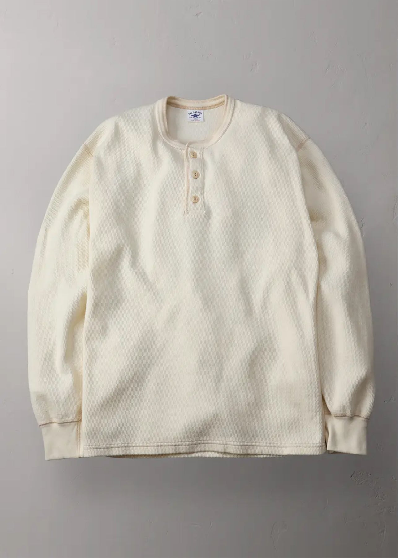 This Henley-neck thermal is made from The Flat Head’s original thermal fabric.