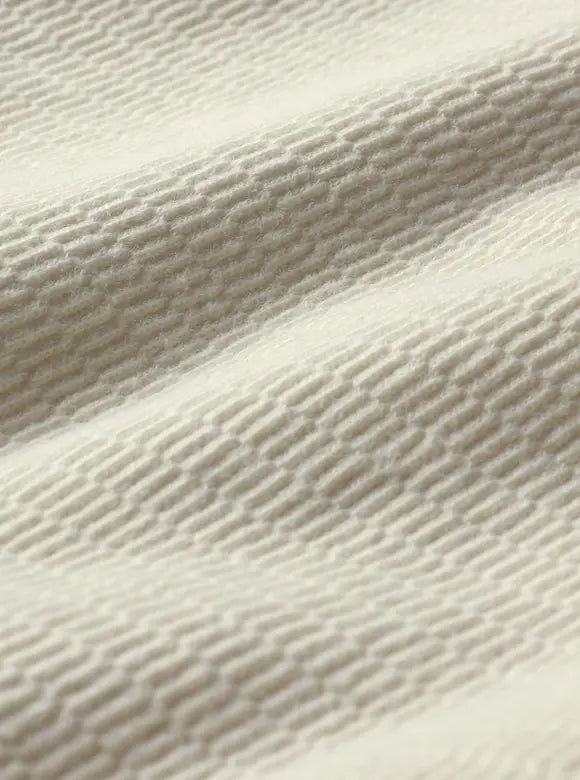 The knit features a vertically oriented honeycomb structure. It offers exceptional stretch horizontally, similar to a net, while resisting vertical stretching. This design keeps the fabric soft and flexible while reducing stretching at the hem, helping the garment maintain its shape over time.