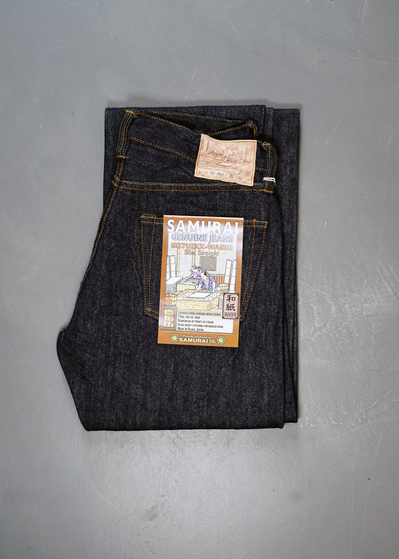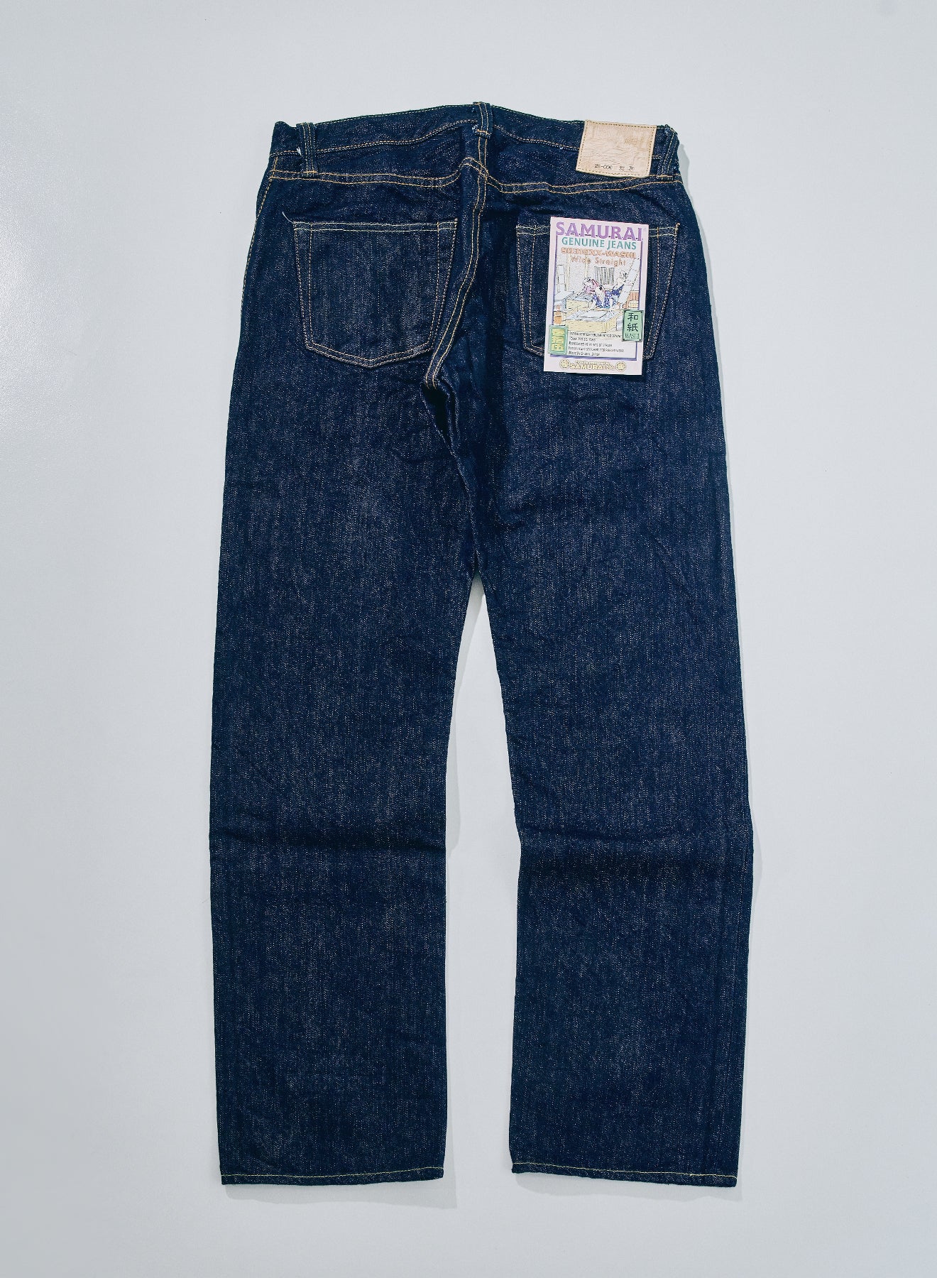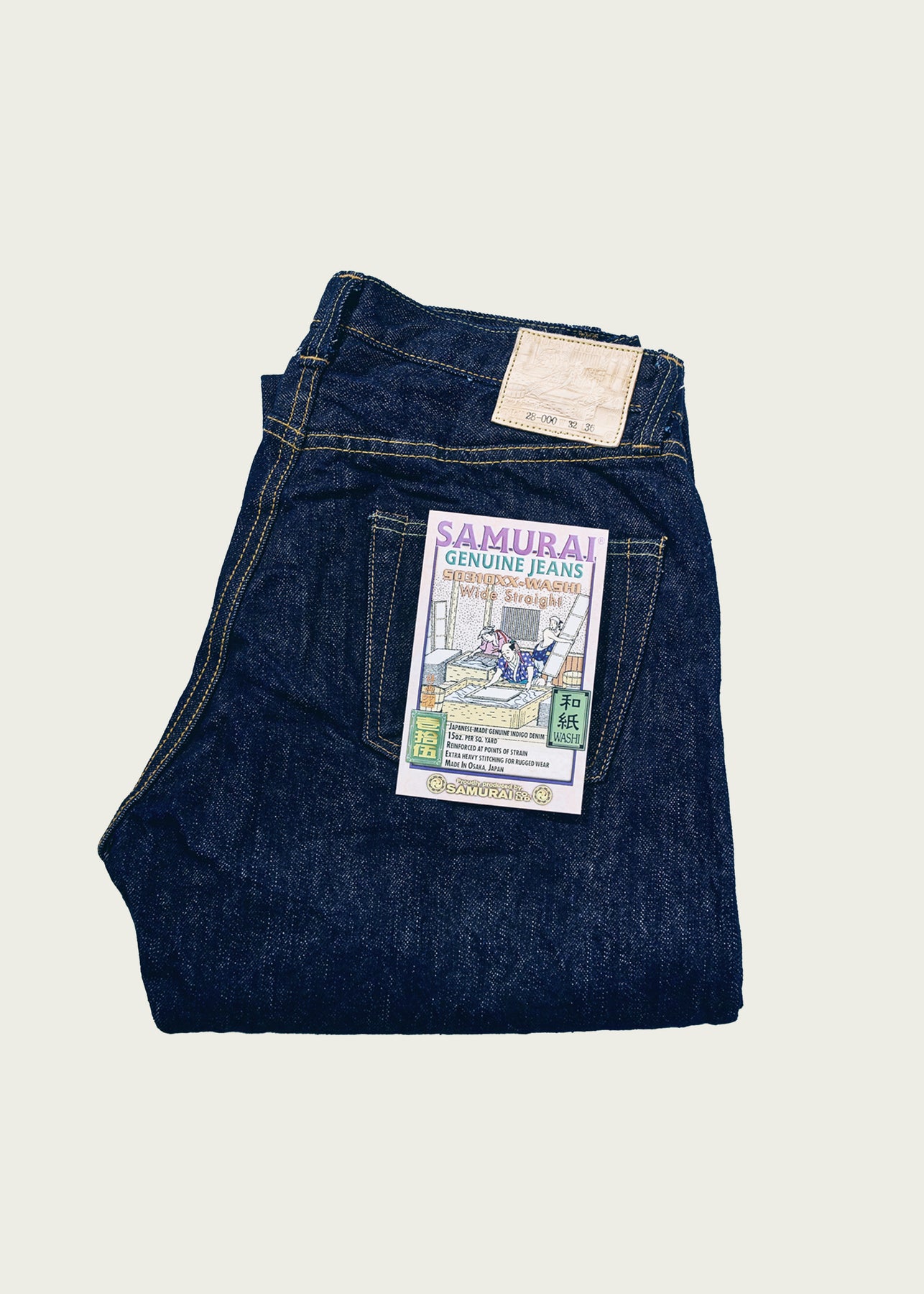 Construction details reflect Samurai’s uncompromising standards: custom-engraved metal buttons, jacquard-woven pocket bags, a selvedge-lined coin pocket, silver lamé selvedge ID, understated tonal arcuates, and a specially produced goatskin leather patch. Each pair is one-washed to ensure stability and consistent sizing, while still preserving the texture and character of unsanforized denim.