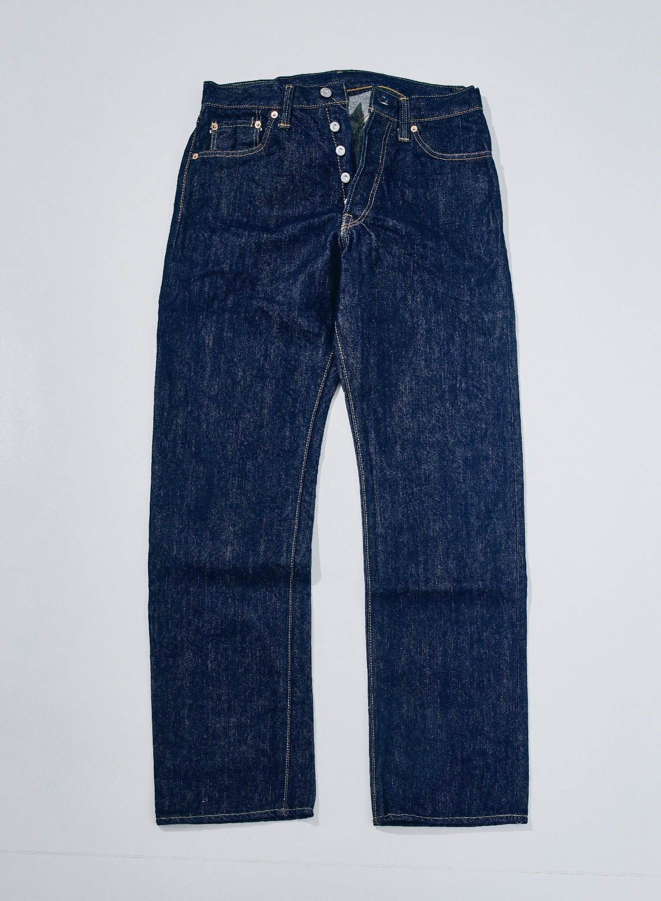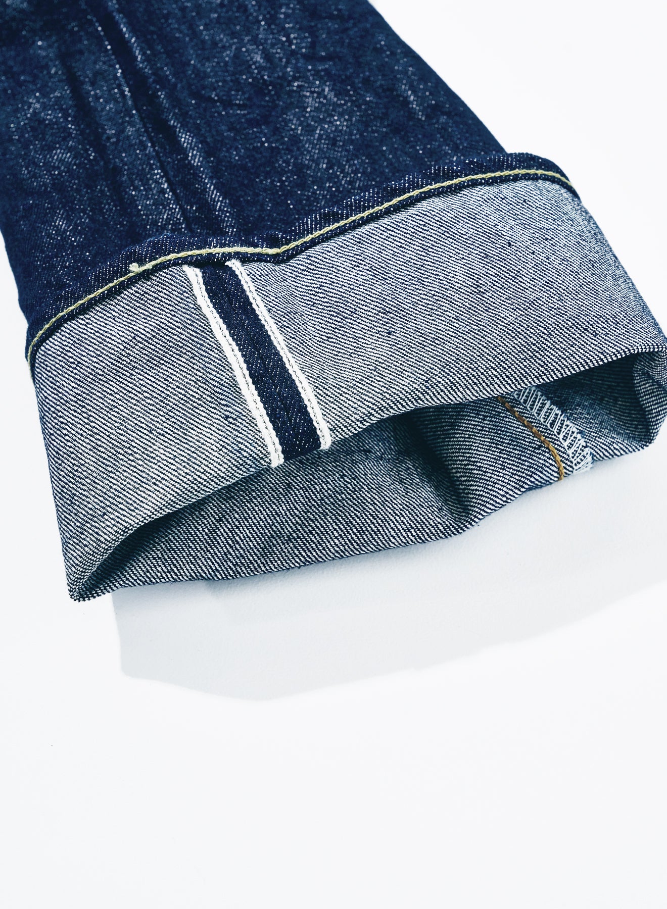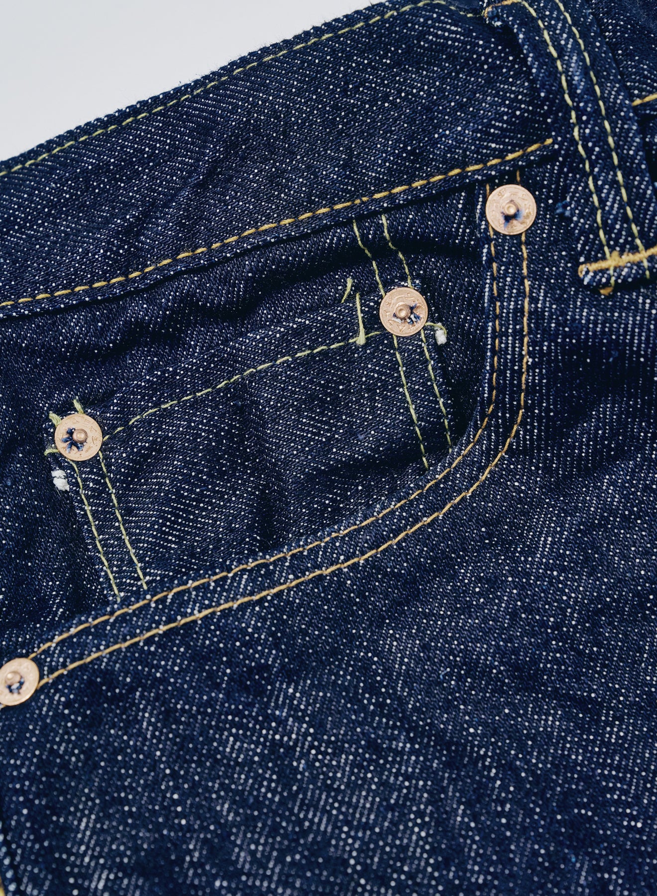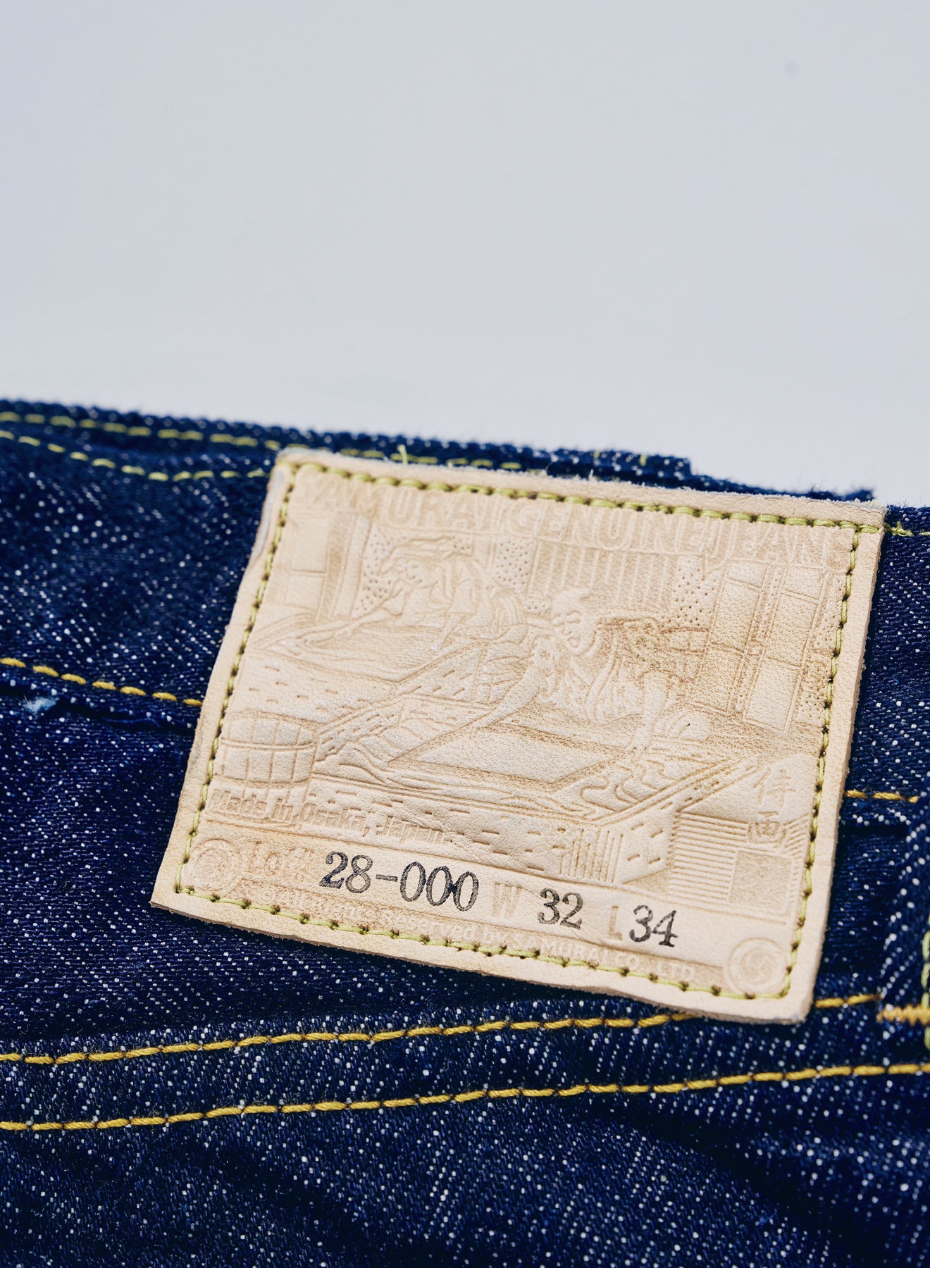 Construction details reflect Samurai’s uncompromising standards: custom-engraved metal buttons, jacquard-woven pocket bags, a selvedge-lined coin pocket, silver lamé selvedge ID, understated tonal arcuates, and a specially produced goatskin leather patch. Each pair is one-washed to ensure stability and consistent sizing, while still preserving the texture and character of unsanforized denim.