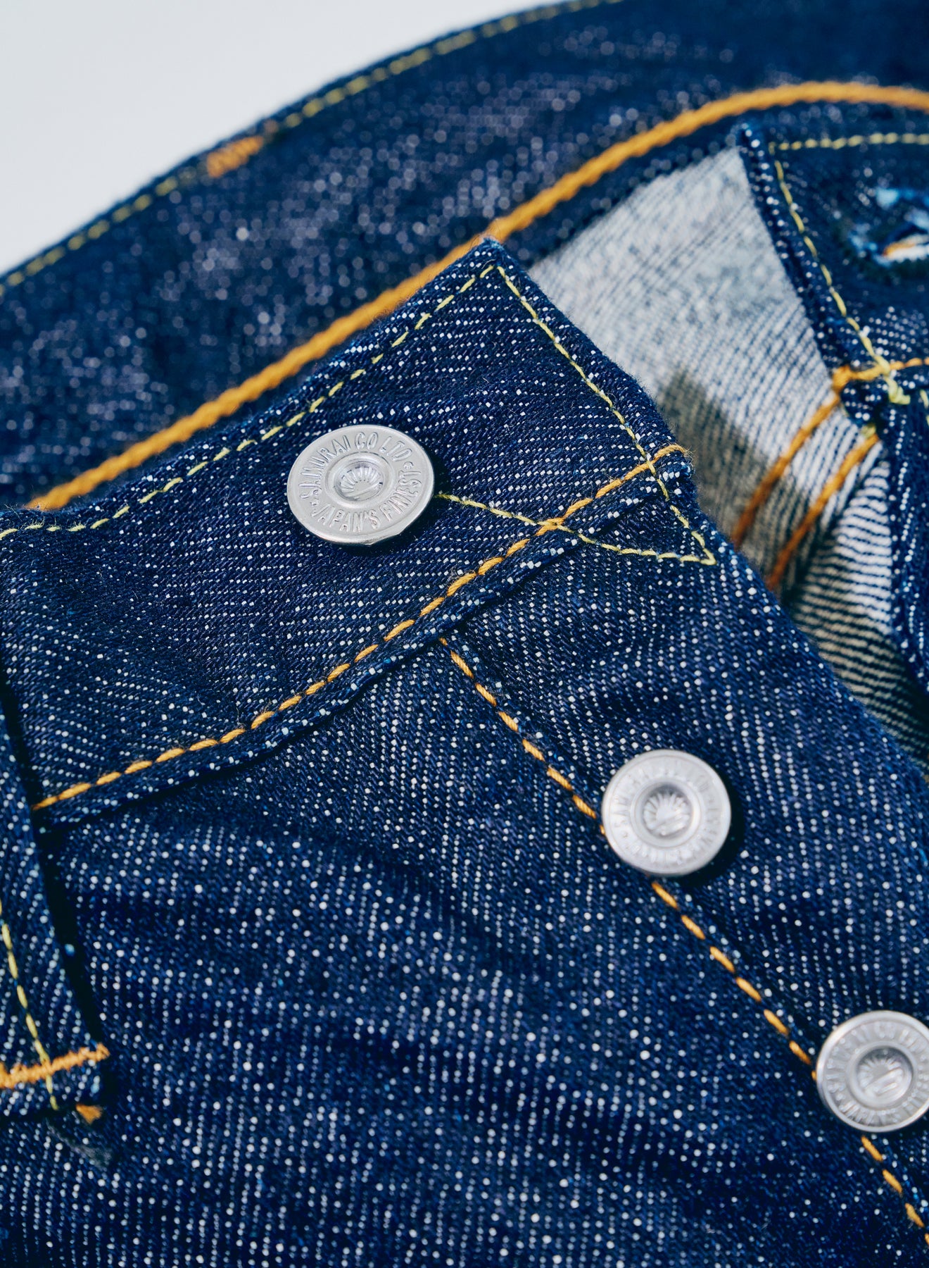 The warp yarns are crafted from Samurai’s own extra-long staple cotton, rope-dyed in rich indigo. This premium cotton brings a smooth texture and refined sheen that contrasts beautifully with the airy, paper-infused weft. Over time, the denim will evolve dramatically, producing bold, high-contrast fades while gradually softening and gaining depth through wear.